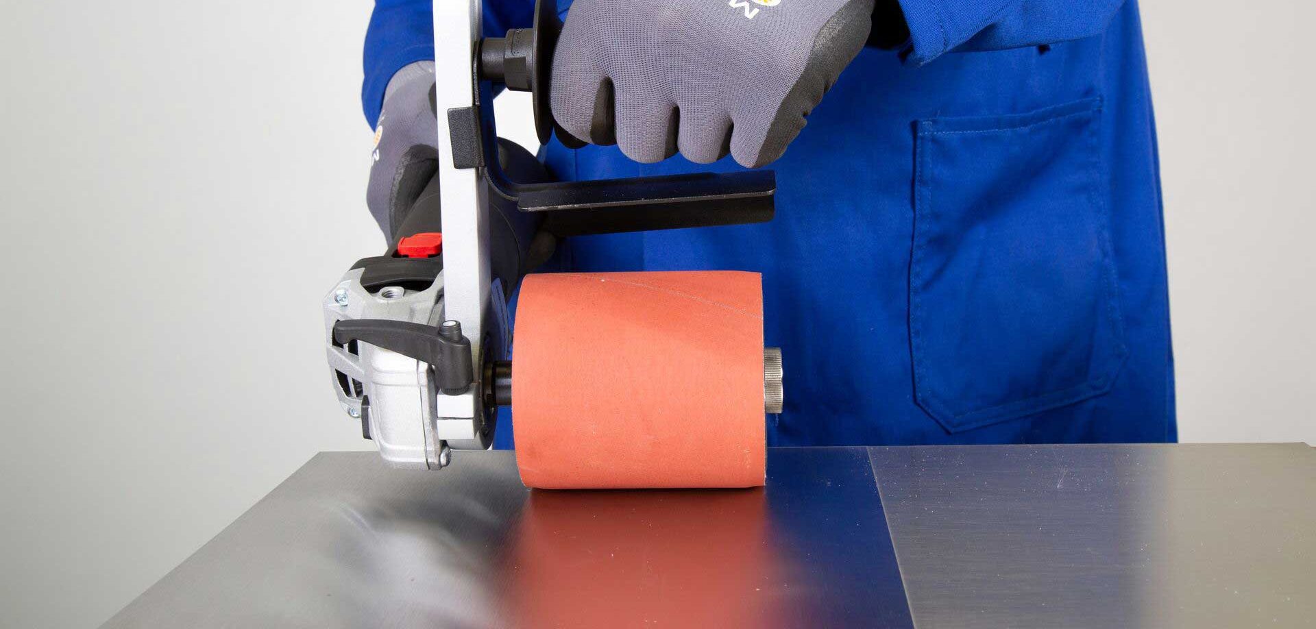 - Fit the spindle onto your grinder to mount the hard and soft rubber drums to mount the abrasive sleeves onto the contact wheel.
